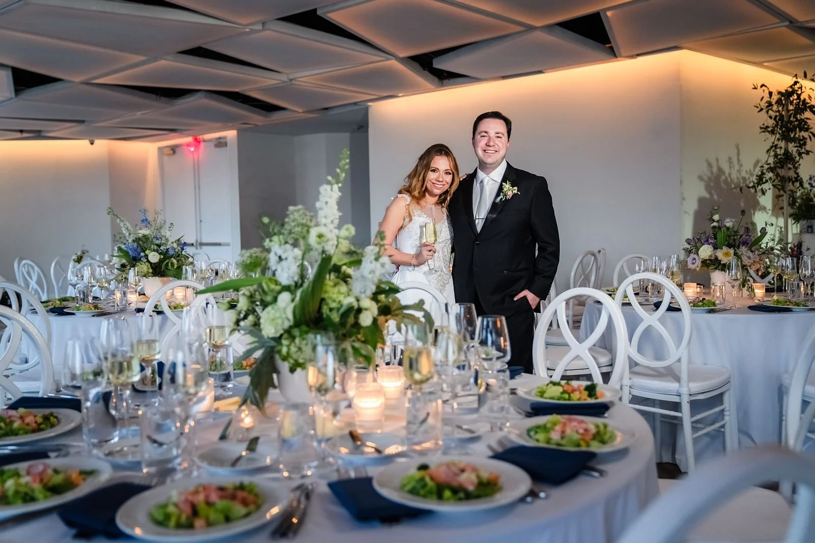 The Sky Room, located on the second floor, is the larger-capacity space. It features floor-to-ceiling windows, a cloud-inspired ceiling, and a 280-degree wraparound terrace with direct marina access. This space can host up to 300 guests for a seated reception with a dance floor, making it ideal for couples planning a lively celebration with a big guest list.